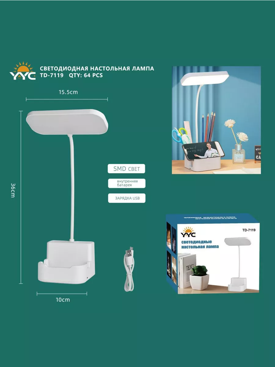 Светодиодный настольный светильник имеет 3 цветовых режима (смотрите фотографии). Лампа настольная светодиодная имеет функцию регулировки яркости на любом из режимов, плавная регулировка яркости осуществляется путем долгого нажатия кнопки. Обширная светящая поверхность лампы со встроенными светодиодами обеспечивает равномерное распределение света, безопасного для зрения. Размеры лампы наглядно показаны на последней фотографии. Светильник настольный работает от встроенного аккумулятора. Заряжается через USB-кабель, который входит в комплект, блок в розетку в комплекте НЕ идет. Ножка светодиодного светильника гибкая, позволяющая менять угол наклона и поворота светящего элемента, основание – устойчивое. Мощность светодиодной лампы – 2,5 W, что при меньших энергозатратах соответствует световому потоку лампы накаливания 30W. Световой поток 300 Лм. Компактный современный светильник идеально впишется в интерьер кабинета, детской, спальни, гостиной. Настольную светодиодную лампу можно использовать при работе с бумагами, за компьютером, для чтения или в качестве ночника; подойдет для школьника или студента. Свет лампы не мерцает, безопасен для зрения, с помощью гибкой ножки можно регулировать угол и высоту наклона. Светодиодный светильник подходит для работы при наращивании ресниц, маникюра, макияжа, а также при любой другой кропотливой работе. Имеется подставка для смартфона. Настольная бестеневая лампа для дома и офиса является практичным и полезным подарком ребенку, школьнику.