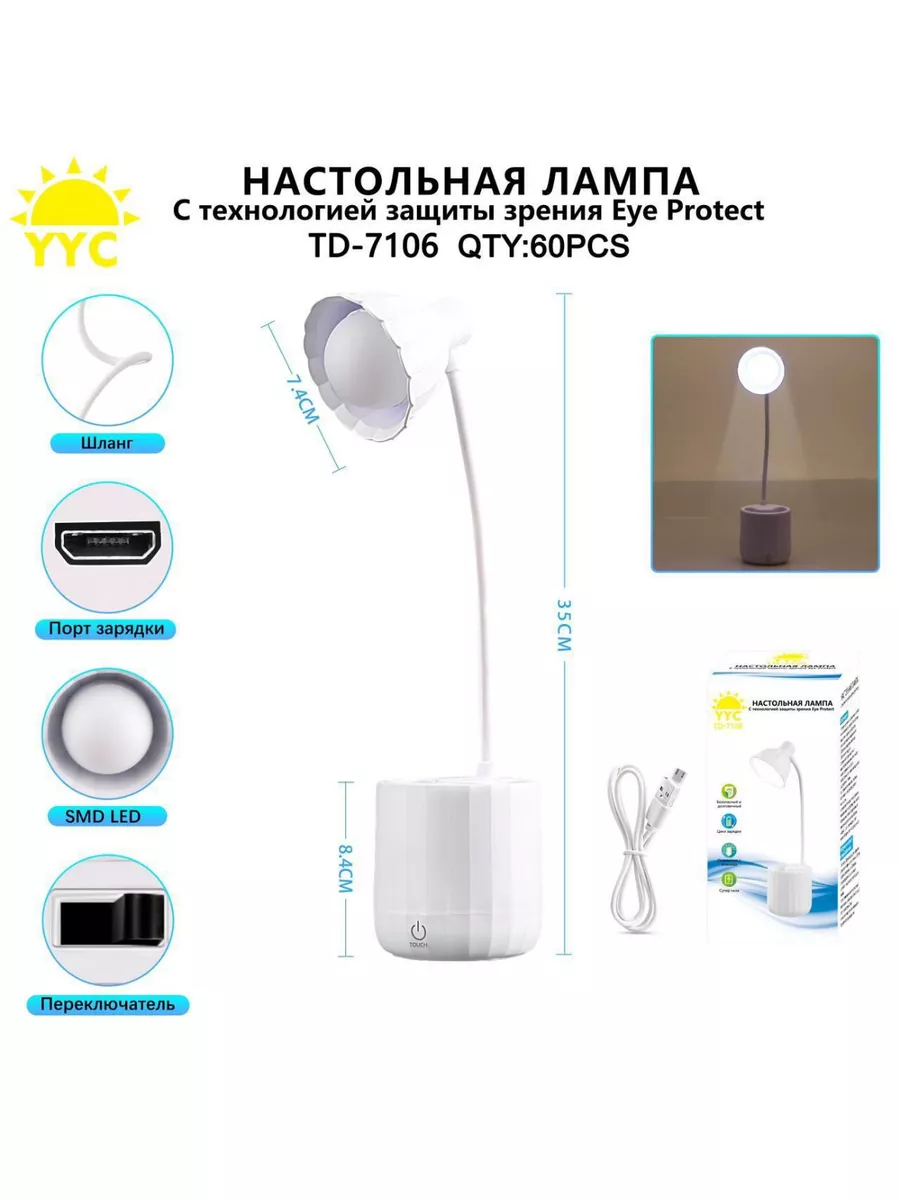 Светодиодный настольный светильник имеет 3 цветовых режима (смотрите фотографии). Лампа настольная светодиодная имеет функцию регулировки яркости на любом из режимов, плавная регулировка яркости осуществляется путем долгого нажатия кнопки. Обширная светящая поверхность лампы со встроенными светодиодами обеспечивает равномерное распределение света, безопасного для зрения. Размеры лампы наглядно показаны на последней фотографии. Светильник настольный работает от встроенного аккумулятора. Заряжается через USB-кабель, который входит в комплект, блок в розетку в комплекте НЕ идет. Ножка светодиодного светильника гибкая, позволяющая менять угол наклона и поворота светящего элемента, основание – устойчивое. Мощность светодиодной лампы – 2,5 W, что при меньших энергозатратах соответствует световому потоку лампы накаливания 30W. Световой поток 300 Лм. Компактный современный светильник идеально впишется в интерьер кабинета, детской, спальни, гостиной. Настольную светодиодную лампу можно использовать при работе с бумагами, за компьютером, для чтения или в качестве ночника; подойдет для школьника или студента. Свет лампы не мерцает, безопасен для зрения, с помощью гибкой ножки можно регулировать угол и высоту наклона. Светодиодный светильник подходит для работы при наращивании ресниц, маникюра, макияжа, а также при любой другой кропотливой работе. Имеется подставка для смартфона. Настольная бестеневая лампа для дома и офиса является практичным и полезным подарком ребенку, школьнику.