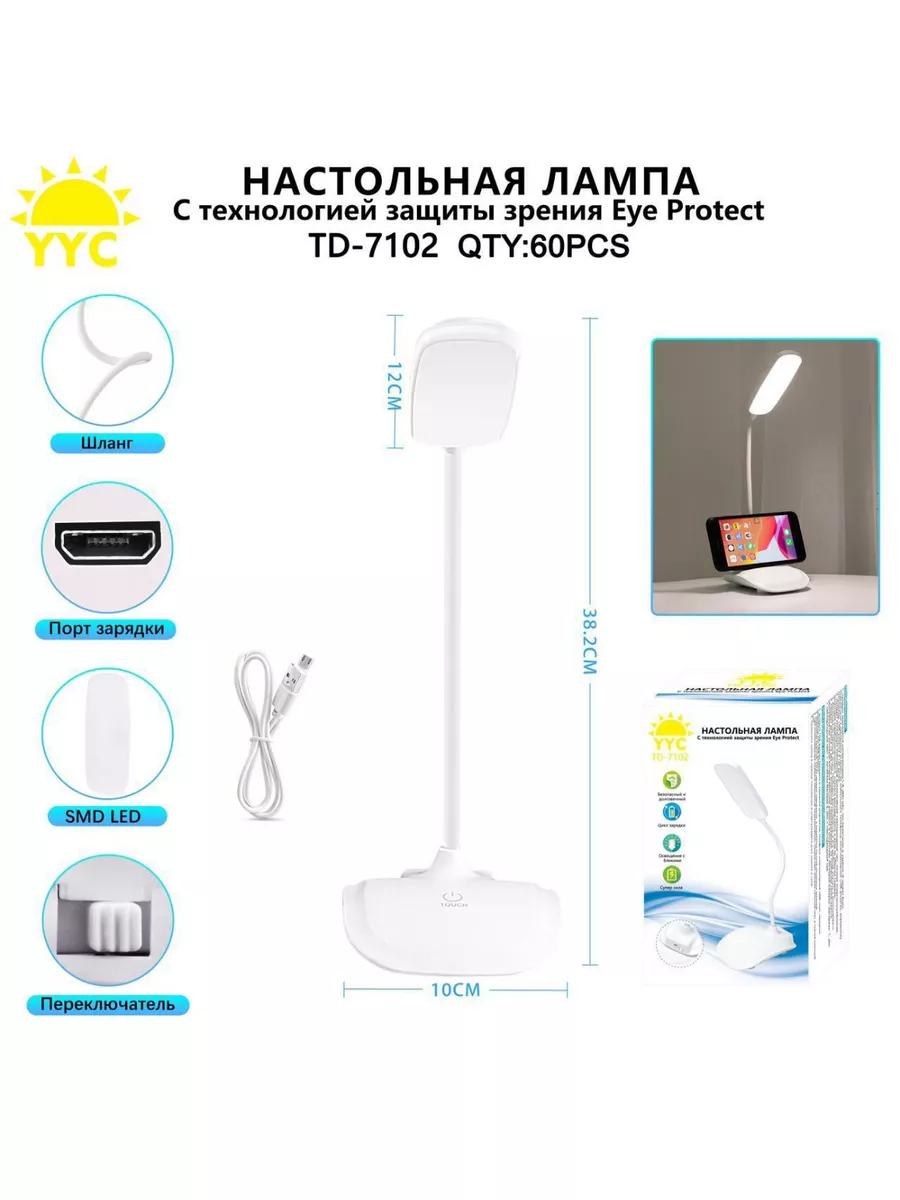 Светодиодный настольный светильник имеет 3 цветовых режима (смотрите фотографии). Лампа настольная светодиодная имеет функцию регулировки яркости на любом из режимов, плавная регулировка яркости осуществляется путем долгого нажатия кнопки. Обширная светящая поверхность лампы со встроенными светодиодами обеспечивает равномерное распределение света, безопасного для зрения. Размеры лампы наглядно показаны на последней фотографии. Светильник настольный работает от встроенного аккумулятора. Заряжается через USB-кабель, который входит в комплект, блок в розетку в комплекте НЕ идет. Ножка светодиодного светильника гибкая, позволяющая менять угол наклона и поворота светящего элемента, основание – устойчивое. Мощность светодиодной лампы – 2,5 W, что при меньших энергозатратах соответствует световому потоку лампы накаливания 30W. Световой поток 300 Лм. Компактный современный светильник идеально впишется в интерьер кабинета, детской, спальни, гостиной. Настольную светодиодную лампу можно использовать при работе с бумагами, за компьютером, для чтения или в качестве ночника; подойдет для школьника или студента. Свет лампы не мерцает, безопасен для зрения, с помощью гибкой ножки можно регулировать угол и высоту наклона. Светодиодный светильник подходит для работы при наращивании ресниц, маникюра, макияжа, а также при любой другой кропотливой работе. Имеется подставка для смартфона. Настольная бестеневая лампа для дома и офиса является практичным и полезным подарком ребенку, школьнику.