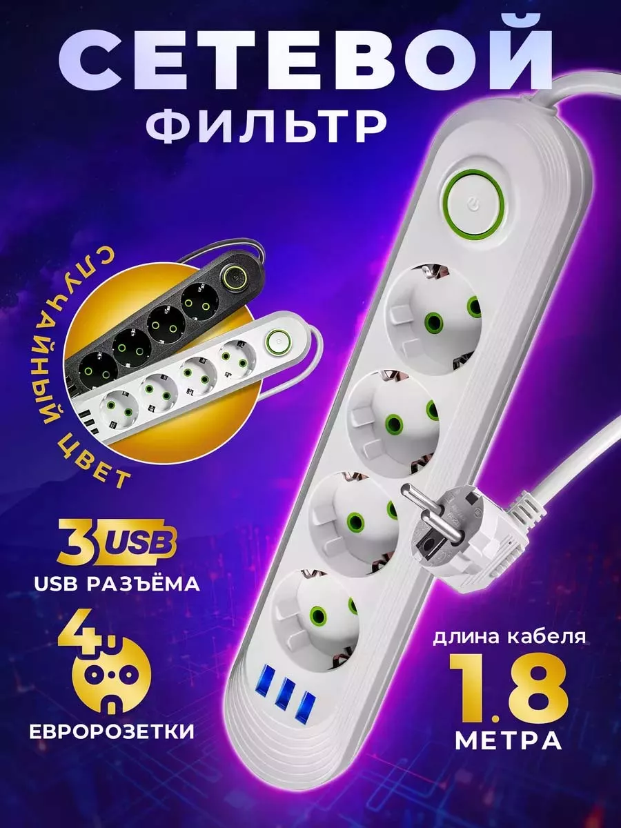 Сетевой фильтр с выключателем на 4 розетки с заземлением порадует надежностью и функциональностью. Бытовой удлинитель предназначен для электроприборов и использования внутри помещений. Предусмотрена возможность крепления на стену как в вертикальном, так и в горизонтальном положении. Антистатичный корпус из жаропрочного пластика выдерживает до 750 градусов. Длина провода 1,8 метра. Мощность 2500 Вт. Переноска оснащена портами usb, которые светятся во время продключения к сети, что позволяет избежать использования громоздких блоков питания при зарядке телефонов, планшетов и прочей электроники. Тройник выпускается в стильном пластиковом корпусе в черном и белом цвете. Удлинитель сетевой фильтр с USB – настоящая находка для всех, кто ценит удобство, безопасность и функциональность. Это не просто тройник, либо переноска – это полноценный электрический аксессуар для вашего дома, который обеспечивает надежную защиту и удовлетворяет самым взыскательным требованиям. Удлинитель с предохранителем, кнопкой включения и защитой поставляется c длинным проводом, который позволяет вам создать удобную систему разветвления. Сетевой фильтр обеспечит безопасное использование зарядки для смартфона, переходников, адаптеров, блока питания ПК, компьютера, ноутбука, телефона, телевизора, чайника, аквариума, гирлянды, лампы, различных электро штекеров и другой электрики и электроники. Поставляется в белом и черном цвете в случайном порядке.